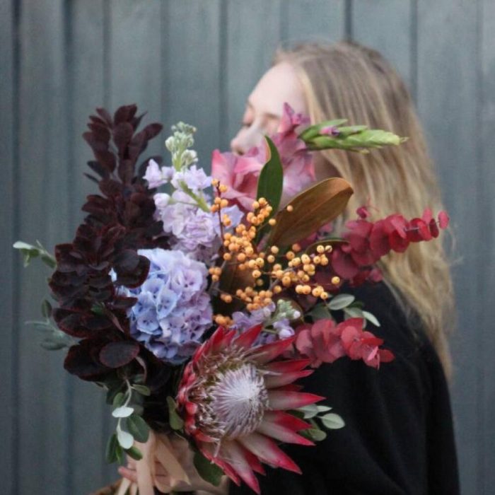 Протея – 1 шт.Гладиолус – 1 шт.илекс ветка – 2 шт.Гортензия – 1 шт.Маттиола – 3 шт.Котинус – 3 шт.листья магнолии ветка – 1 шт.эвкалипт стабилизируемый – 2 шт.Питтоспорум – 2 шт.Лента – 1 шт.