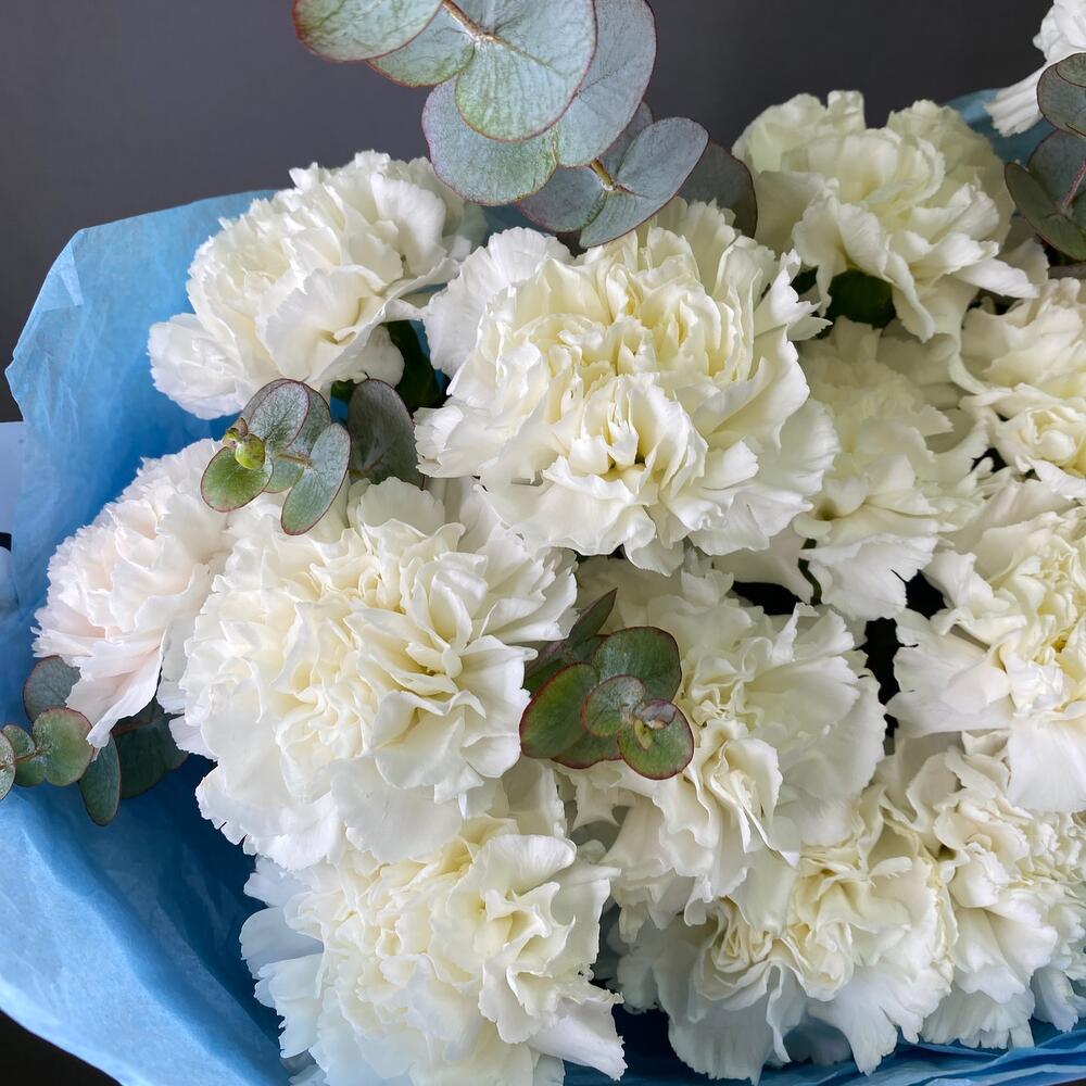 Диантус сортовой – 15 шт.Эвкалипт – 1 шт.Тишью – 2 шт.Упаковка дизайнерская – 1 шт.