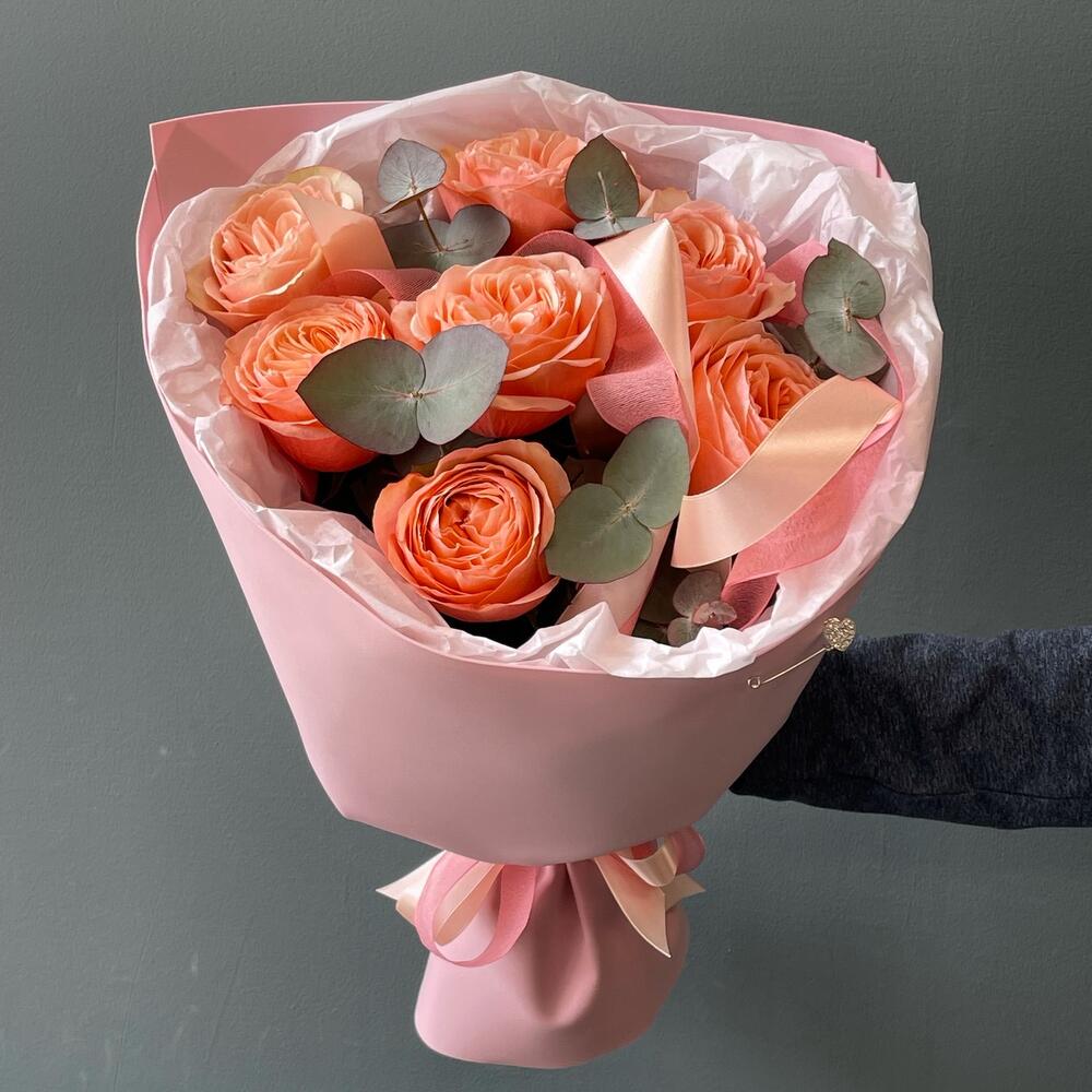 Лента – 1 шт.Эвкалипт – 2 шт.Роза одноголовая – 7 шт.Тишью – 1 шт.Упаковка дизайнерская – 1 шт.