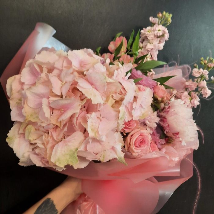 Гортензия – 1 шт.Пион Сара Бернар – 1 шт.Роза пионовидная – 3 шт.Роза кустовая – 3 шт.Альстромерия – 3 шт.Маттиола – 2 шт.Фисташка – 3 шт.Упаковка дизайнерская – 1 шт.