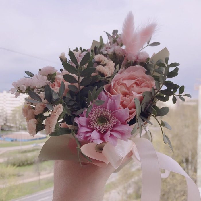 Статица – 2 шт.Хризантема – 1 шт.Пионовидная роза – 1 шт.Лагурус – 3 шт.Флористическая губка – 1 шт.листья фисташки – 1 шт.