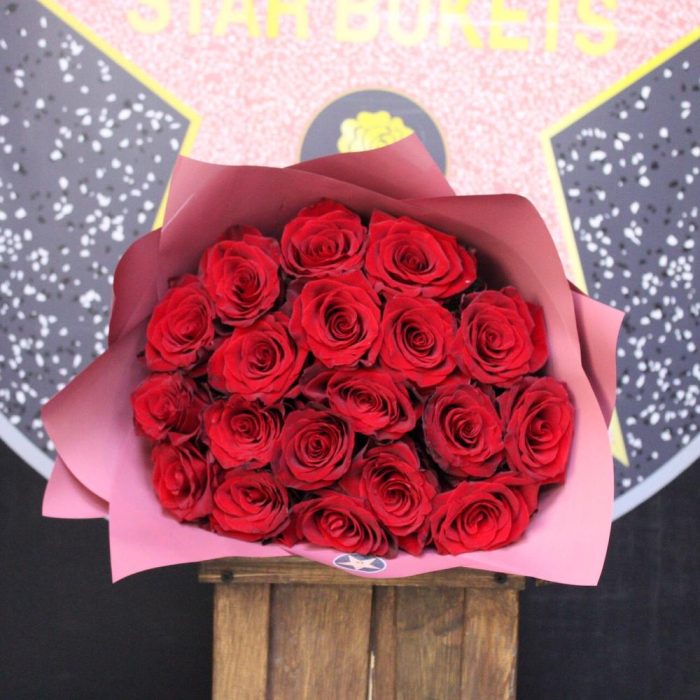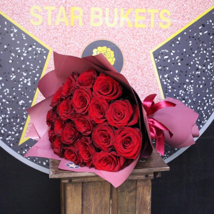 Лента атласная – 1 шт.Роза Эксплорер – 19 шт.Пленка дизайнерская – 3 шт.
